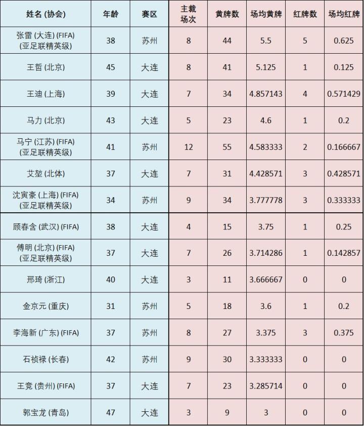 (图)第一阶段裁判员红黄牌数据(执法三场以下的除外)