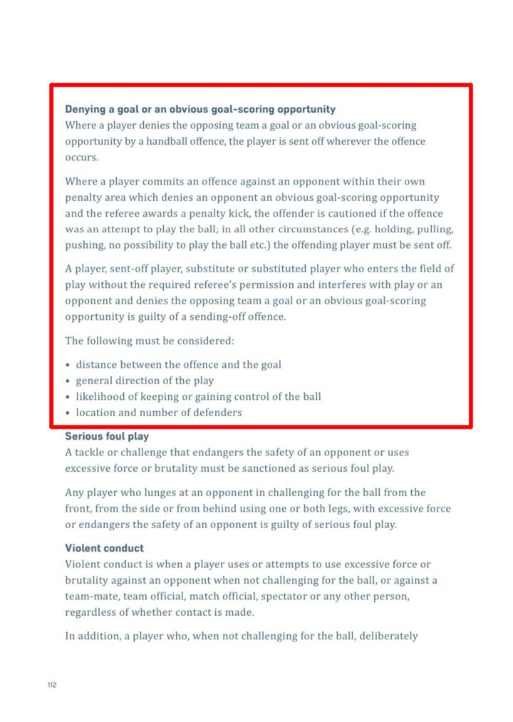 而以下三次涉及DOGSO的判罚,主要争议点则在于案例中的犯规是否破坏了明显的进球得分机会。根据规则,判断是否为DOGSO,需要考虑以下四点: