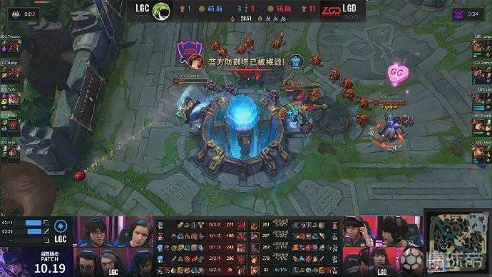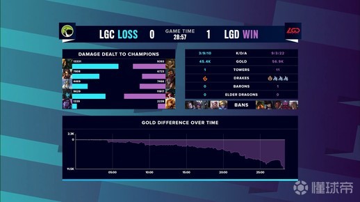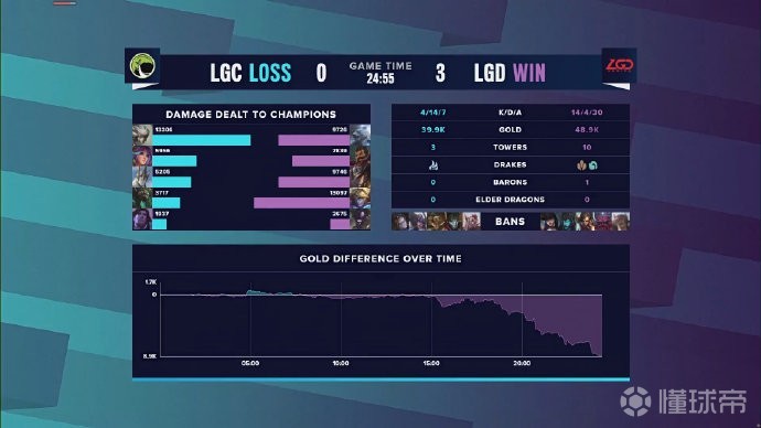 第24分钟,LGD凭借大龙buff,推掉LGC中下两路高地和一座门牙塔。紧接着,双方中路遭遇,LGC被团灭,LGD拿下比赛。