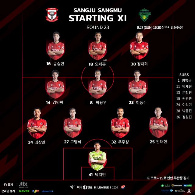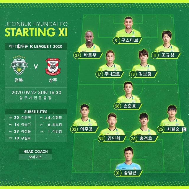 韩国当地时间9月27日下午,2020赛季韩国足球K1联赛争冠组比赛展开争夺。已经提前确定降级的尚州尚武迎来了全北现代汽车的挑战,本赛季尚武在主场曾经1-0击败过全北,因此全北也希望能够在客场完成复仇。而对于尚武来说,他们并没有成绩上的压力,只是希望打出好的成绩来回报球迷的信任。因此本场比赛尚州尚武尽遣替补登场,高明锡、禹周成以及U22的小门将朴志旼登场亮相。从首发来看,至少全主力的全北更应该被看好。