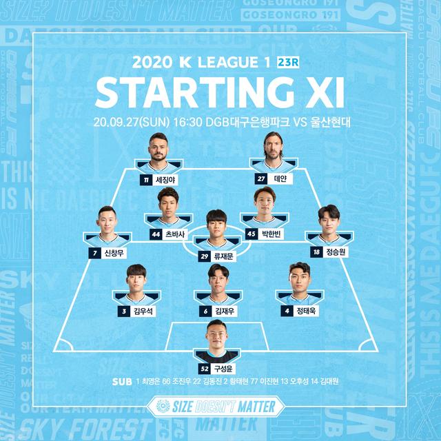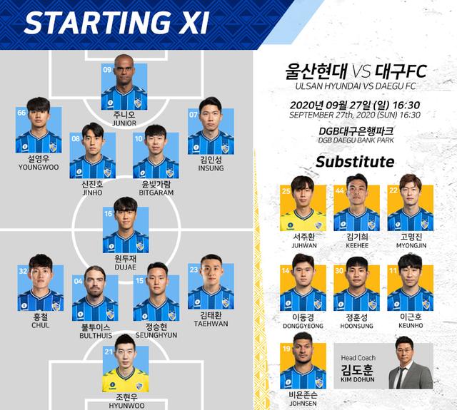 韩国当地时间9月27日下午,2020赛季韩国足球K1联赛争冠组比赛展开争夺。周中在足协杯120分钟点球苦战晋级的蔚山现代前往客场迎战大邱FC,对于积分榜排名第一的蔚山现代来说,大邱是他们必须要战胜的对手。在上次交手,蔚山1-1和大邱打平,也被全北迫近了积分。因此尽管周中足协杯他们很疲劳,但依旧是尽遣主力出战。而主场作战的大邱FC也摆出了相应的架势,除了因伤休息的埃德加,其余球员均为主力。由于尚州尚武晋级前四,因此前五存在拿到亚冠资格的机会,大邱也在为自己的命运而战。