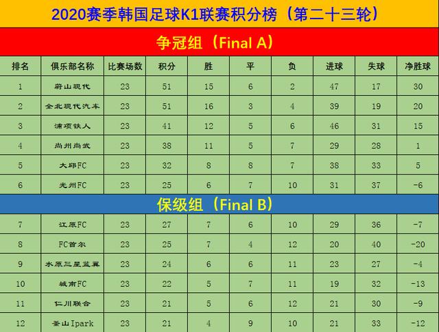 韩国足球新闻韩国当地时间9月26~27日,2020赛季韩国足球K1联赛的季后赛全面打响,在争冠组(Final A)和保级组(Final B)的比赛中,各队也使出了浑身解数为梦想而战。在“国家德比”,水原三星蓝翼主场3-1雪耻,时隔5年5个月再胜死敌的同时,也让自己脱离降级区,而在另外两场事关保级的比赛中,仁川客场6-0大胜城南,江原客场2-0击败釜山,导致仁川和釜山“互换座次”,釜山成为了倒数第一,保级形势变得微妙起来。