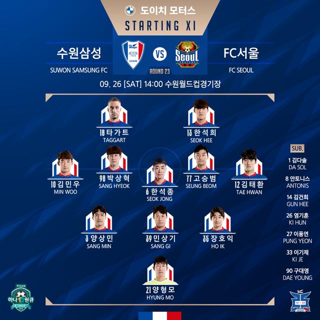 作为总决赛阶段的揭幕战,联盟会安排哪场比赛作为开端呢?“国家德比”再合适不过了,一方面两支球队的恩怨情仇,另一方面也因为两支球队一度代表了韩国足球的最高水准。9月26日,水原在主场迎来了首尔的“第三次挑战”。此役水原主帅朴建夏将塔加特和韩奭熙这对搭档放在了首发,而在后防线上,300场的老将梁相珉也获得了登场的机会;首尔方面由于代理主帅金浩荣和俱乐部的矛盾升级后辞职,因此本场比赛首尔的阵容基本维系了此前的阵容,老将朴主永领衔锋线。自2015年之后,首尔在联赛层面没有输给过水原,他们自然也希望延续这样的好成绩。