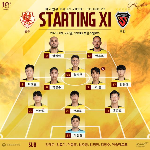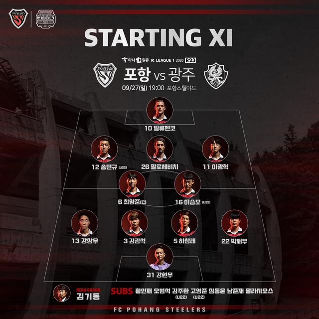 韩国当地时间9月27日晚,2020赛季韩国足球K1联赛争冠组最后一场比赛在浦项上演。由于浦项铁人在周中的足协杯失手,因此他们也将进军亚冠的希望寄托在了联赛争三上。与光州FC的比赛,除了受伤的球员和体能不佳的帕拉西奥斯外,其余主力悉数登场。而光州方面则是一反常态,在首发派出了费利佩和乌雷尼亚的双外援中锋组合,而韦礼安、严原上也都悉数登场。双方从一开始以全主力登场的态度,也表明了这场比赛绝对没有一方甘愿送上三分。