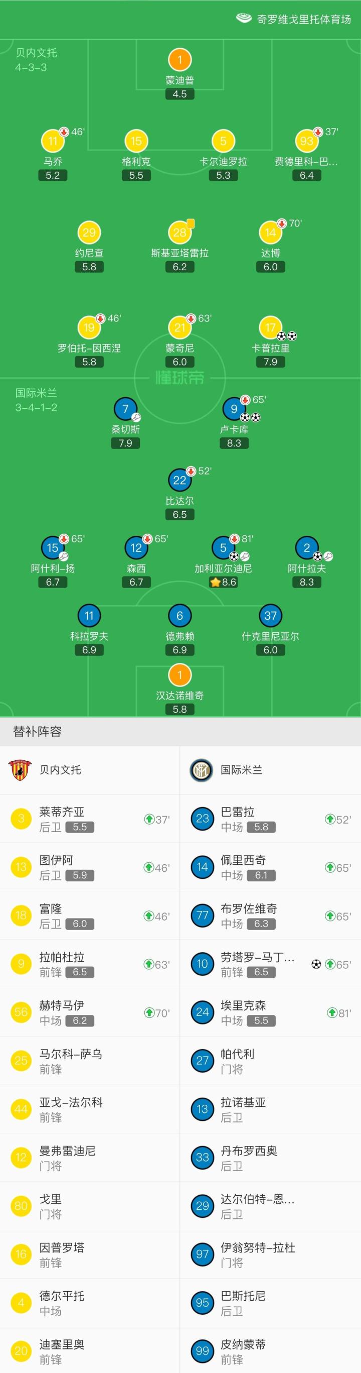 贝内文托首发:1-蒙迪普、11-马乔(46' 18-富隆)、5-卡尔迪罗拉、15-格利克、93-费德里科-巴尔巴(37' 3-莱蒂齐亚)、28-斯基亚塔雷拉、14-达博(70' 56-赫特马伊)、29-约尼查、17-卡普拉里、19-罗伯托-因西涅(46' 13-图伊阿)、21-蒙奇尼(63' 9-拉帕杜拉);