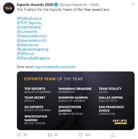 Esports Awards年度最佳电竞战队:TES、G2、DWG入围