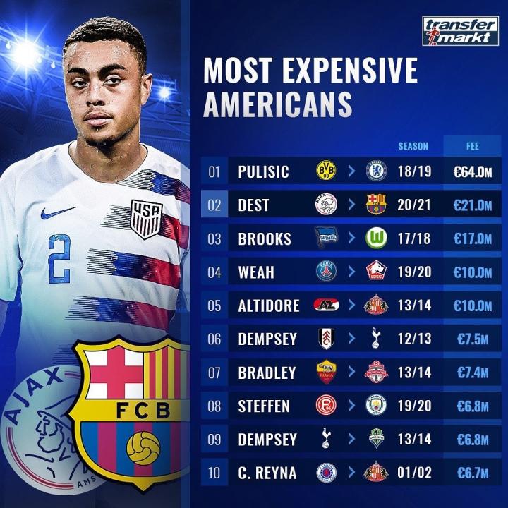 在德斯特加盟巴萨后,德国转会市场网站盘点了美国球员转会费排行榜,德斯特以2100万欧排名第2,位居榜首的是普利希奇。
