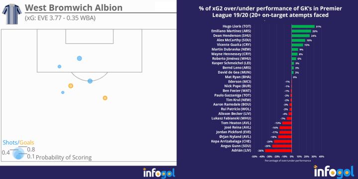 西布朗对埃弗顿的xG2射门图,19/20英超门将xG2封堵数据表现