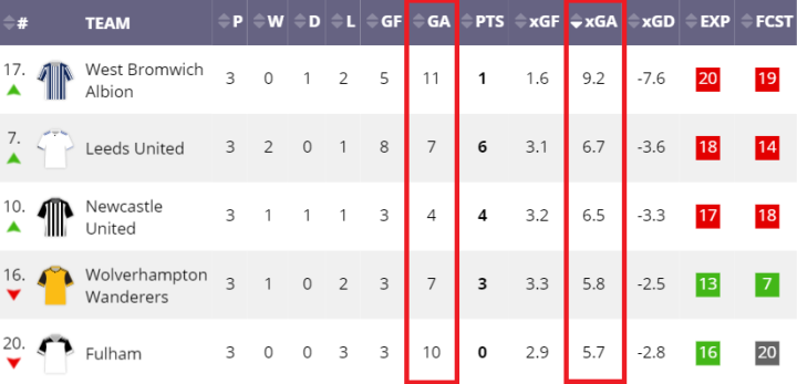有趣的是,虽然这令人担忧,但有四支球队在本赛季的预期已进球(xGA)中表现比他还糟糕——西布朗、利兹联、纽卡斯尔和狼队。