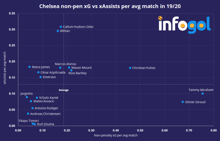 切尔西19/20赛季非点球xG散点图