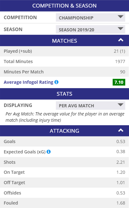 瑞安·布鲁斯特是一名年轻的球员,在目前的利物浦阵容中似乎是多余的,他在19/20赛季在斯旺西度过一段时间后,他可能会在本赛季被再次租借出去。他在上赛季的英冠中场均0.38 xG。