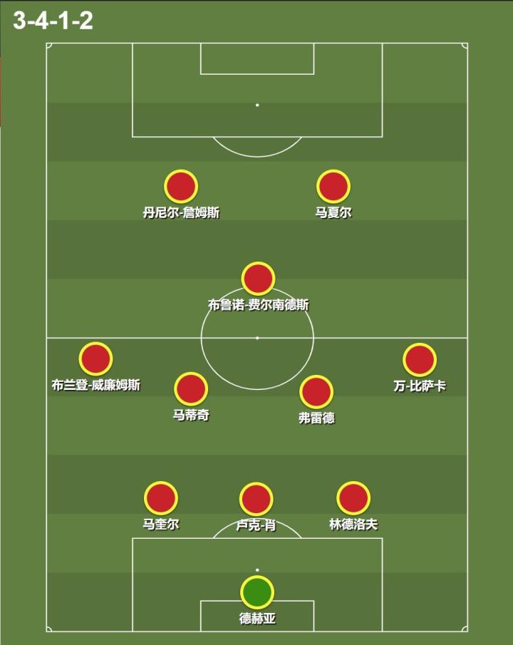 就中前场而言,曼联现有的人员配置也不难适应3-4-1-2。马蒂奇在孔蒂的三后卫体系里扮演过重要角色,布兰登-威廉姆斯和万-比萨卡在上赛季都担任过边翼卫并有着尚佳表现,同时在防守压力不大的比赛里,曼联可考虑将进攻能力更强、速度更快的丹尼尔-詹姆斯派遣至一侧边路,将边翼卫进一步转型为边锋。此外,无论是四后卫还是三后卫体系,对于B费的"10号位"角色都没有影响。