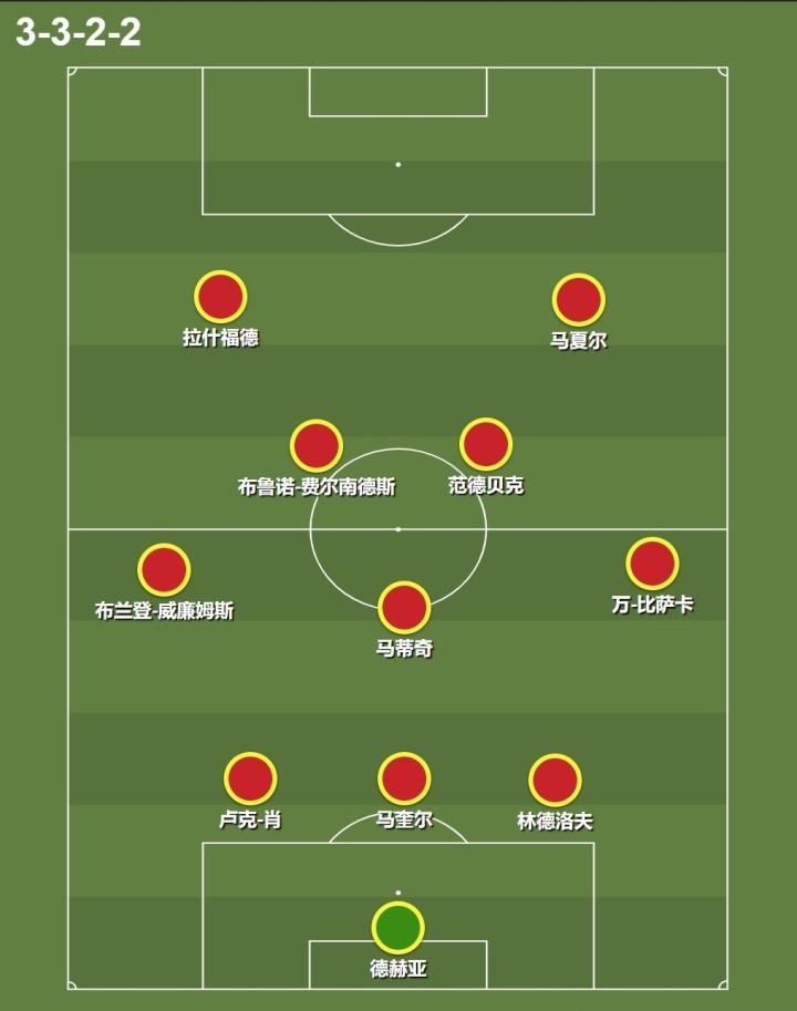 接下来说"6号位双核",4-2-3-1阵型中出于对两名中后卫身前的保护,索尔斯克亚通常会派上两名防守型中场,然而无论博格巴、马蒂奇、麦克托米奈怎样组合,对进攻端的贡献都十分有限。而在3-4-1-2体系中,由于三中卫比双中卫在中路防守上可以更加立体协防,在面对中下游球队时,索尔斯克亚完全可以只派出一位防守型中场,而把另一个位置留给盘带和出球能力更强的弗雷德,或是进攻特点更加鲜明且活动区域更靠前的范德贝克。