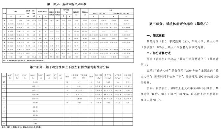 根据《国家队体能达标测试评分标准(2020 年 2 月版)》要求,体能达标测试分为基础体能测试、躯干稳定性和上下肢左右侧力量均衡性测试以及板块体能测试。