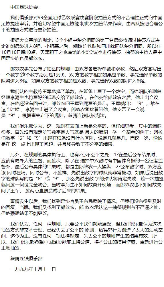 最终绵阳丰谷凭借着这个说不清道不明的9成功晋级,不过毅腾连铁俱乐部事后向中国足协提出申诉,他们认为抽签过程存在提前泄密情况,而绵阳丰谷并不能证明他们选择的阿拉伯数字是9,而不是6。