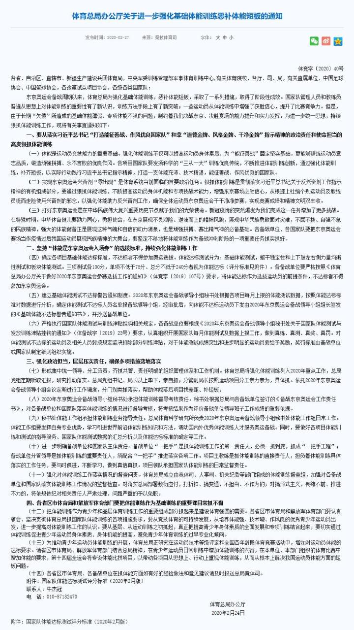 今年2月24日,体育总局办公厅发布《体育总局办公厅关于进一步强化基础体能训练恶补体能短板的通知》称,各备战单位需将体能达标作为选拔运动员的前提条件,不达标者不得参加东京奥运会。