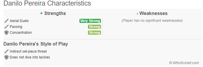 当然,佩雷拉也有自己的缺点,作为一名偏于防守的球员,葡萄牙国脚盘带速率偏慢,很难做到亚亚图雷那样的推土机推进,近几个赛季他对于对方禁区的影响力也相对有限。在防守端,身材高大的他有时面对小快灵对手也会出现被晃开的情况。