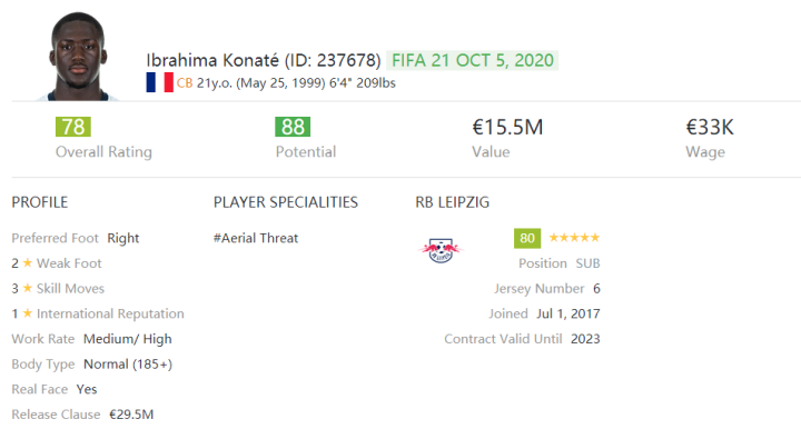 科内特(莱比锡RB)21岁,中卫,能力值78,潜力值88