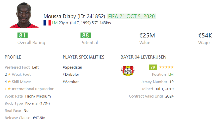 穆萨-迪亚比(勒沃库森)21岁,左边前卫,能力值81,潜力值88