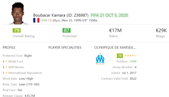 现实世界中,卡马拉的前途也是一片光明的,这位1999年底出生的小将,前几个赛季作为马赛的中卫出道,上赛季他逐渐被维拉斯-博阿斯改造成了一位后腰,并展现了出色的夺回球权能力,充沛的体能和优秀的脚下技术,他的出色发挥也帮助马赛拿到了本赛季的欧冠门票。卡马拉同样也是法国U21国家队的重要成员,他目前是球队的主力后腰。