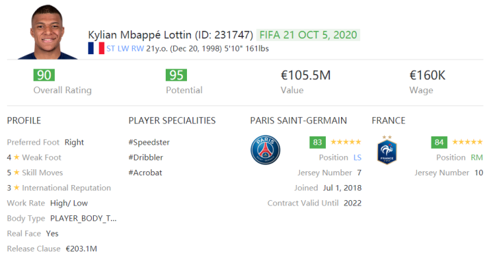 游戏中的姆巴佩拥有速度狗,盘带高手和杂耍高手三个特性,能力值90的他在FIFA21中已是一位巨星级别的人物。96的速度和爆发力让他能轻松突破对手的防线,92的敏捷,92的盘带和90的控球让他在边路亦能闪转腾挪完成技巧突破,此外,92的反应,91的终结能力和91的跑位让他也能出现在中路担当终结者。此外,姆巴佩的体能也达到了出色的86。