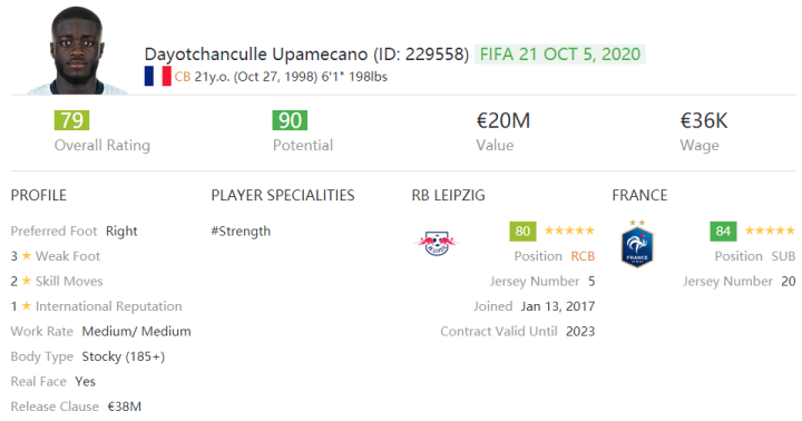 游戏中的于帕梅卡诺能力值比预想的稍低,相比于FIFA21给出的79能力值,不少球迷认为81-82的能力值更符合莱比锡后防大将的身份。不过潜力值上,EA并没有“亏待”于帕,而是给出了90的超高数值,这也侧面显示出了这位新晋法国国脚的无穷潜力。90的强壮,88的头球,84的抢断让于帕梅卡诺在游戏里颇具威力,84的速度则让他在游戏里也显得较为迅速。