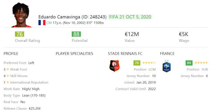 卡马文加(雷恩)17岁,中前卫,能力值76,潜力值88
