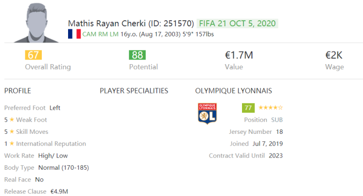 谢尔基(里昂)17岁,前腰,能力值67,潜力值88