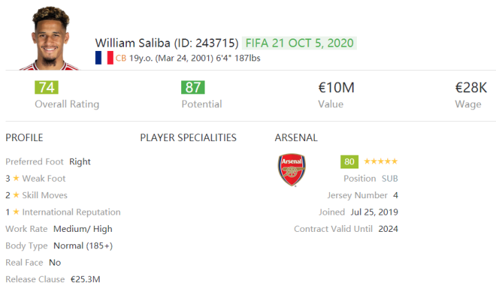 萨利巴(阿森纳)19岁,中卫,能力值74,潜力值87