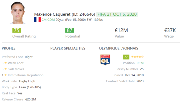 卡克雷(里昂)20岁,中前卫,能力值75,潜力值87
