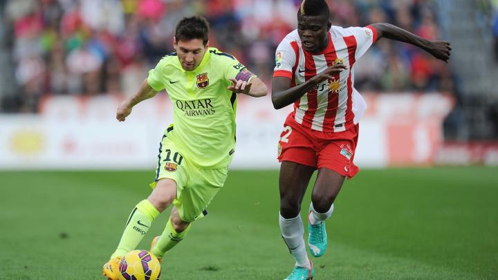 (图)租借效力阿尔梅里亚期间,托马斯与梅西对抗