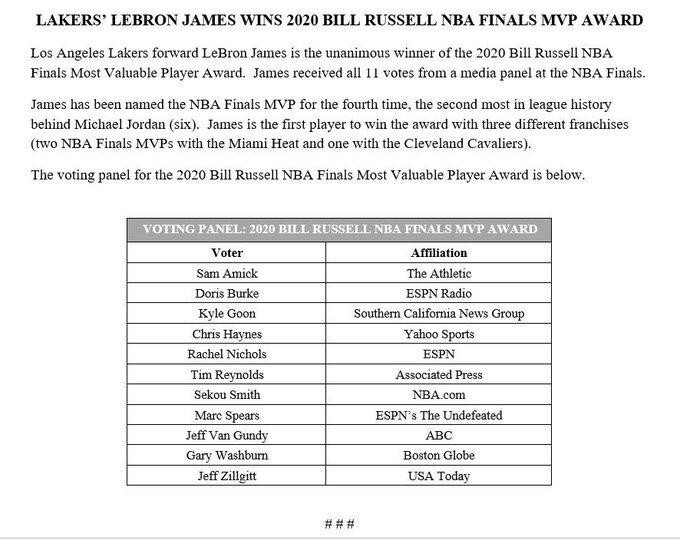 王者风范!詹姆斯第四次加冕总决赛MVP李红旗 @懂球帝2020-10-12 10:12湖人夺得第17座总冠军,詹姆斯最终成功当选总决赛MVP。这是他第四次获得此荣誉,此前他分别在2012、2013、2016年获得过总决赛MVP。另外,詹姆斯也成为NBA历史上第一位在三支不同的球队夺得FMVP的球员。值得一提的是,詹姆斯得到了FMVP评委的11张全部选票。詹姆斯说:“我也想要得到这该死的尊重!在我的职业生涯中,我从未错过任何一场季后赛,能为队友付出的最好的事情就是一同上场。”展开更多