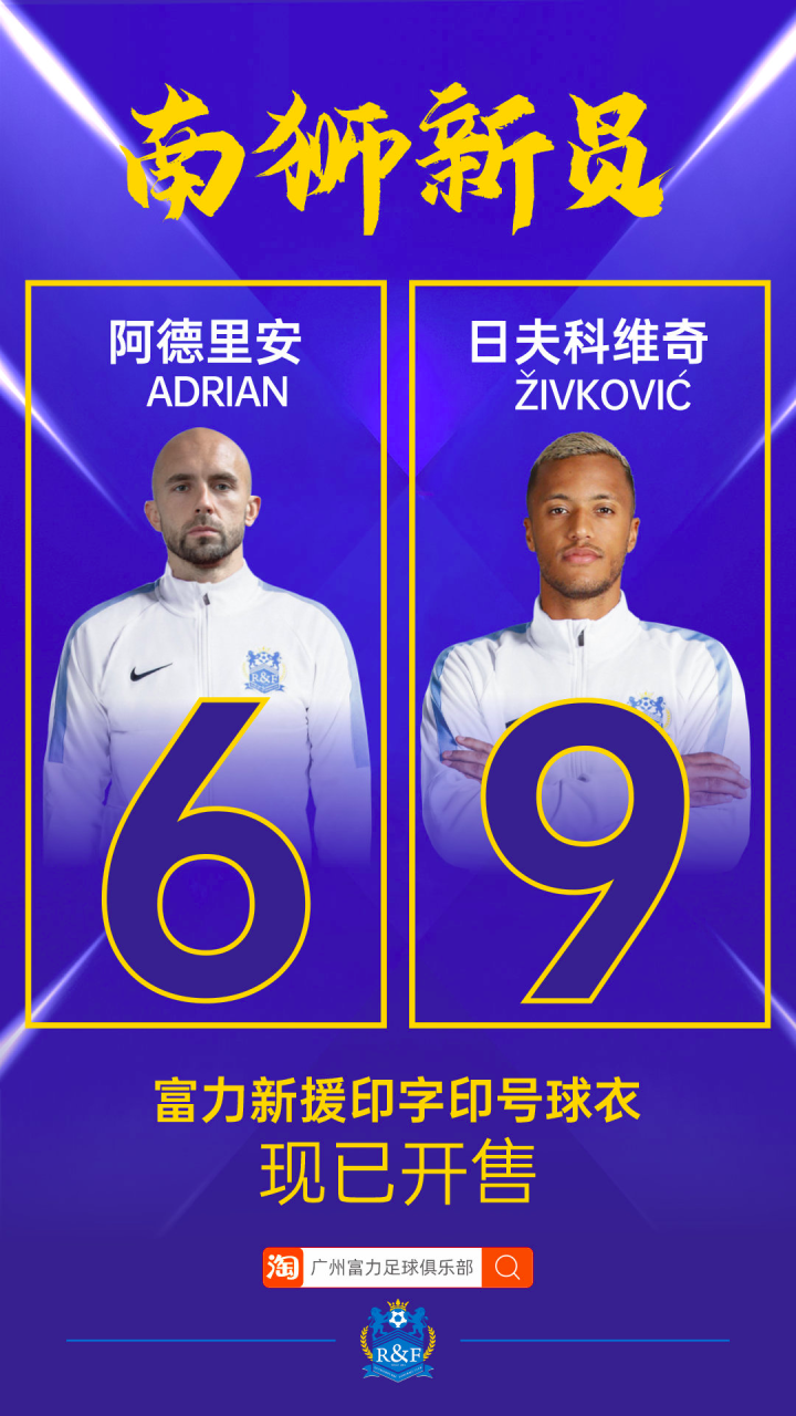 两位新援的号码确定!阿德里安和日夫科维奇将分别身...广州富力足球俱乐部 @懂球帝2020-10-12 14:29两位新援的号码确定!阿德里安和日夫科维奇将分别身披6号和9号球衣,他们的印号球衣现已登陆官方商店,快来选购吧!展开更多