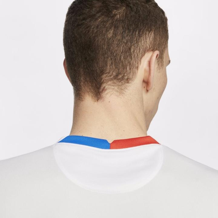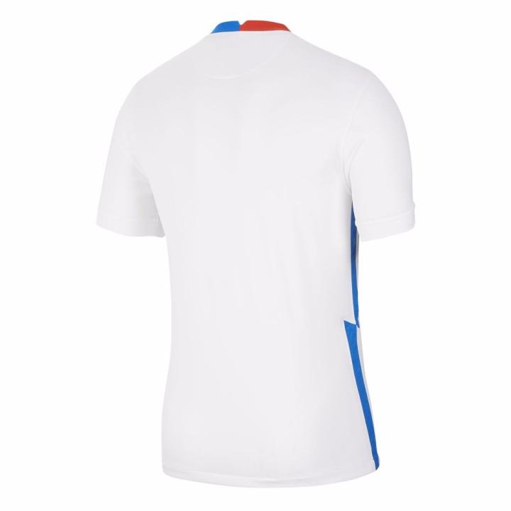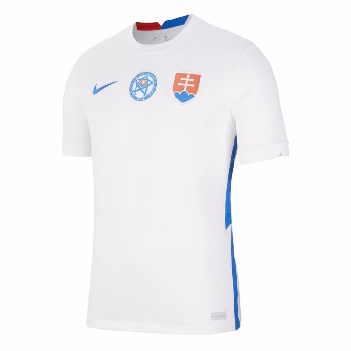 客场采用传统白色设计,球衣两侧的蓝色透气条带上加入与主场球衣相同的3D热压图案。除此之外,客场球衣衣领后半部分采用红、蓝两色设计,与白色球衣一同组成斯洛伐克国旗形象。