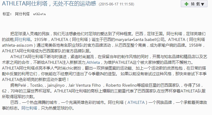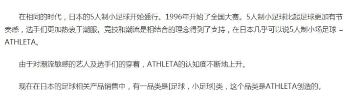 其实在日本市场,和足球相关的品牌多如牛毛,在11人制足球方面我就不多介绍。在五人制足球方面,除了adidas,nike,puma,mizuno和asics这些品牌,hummel,desporte和joma的室内足球鞋,都比阿什利塔要强势的多,阿什利塔只能算一个日本二线的足球运动服装品牌,在足球鞋方面根本不入流,在日本乐天网站上,2018年时,根本连足球类目都进不去。但是这些情况,国人并不了解,日本人也知道中国人不了解。所在近年,阿什利塔打着巴西三夺世界杯,日本潮流足球品牌的大旗,用日本人传统的花小钱办大事的套路来到了中国市场。用全袋鼠皮的高大上噱头打入中国业余足球市场,还算比较成功,毕竟这个品牌是有备而来,他们摸准了中国人的心态。