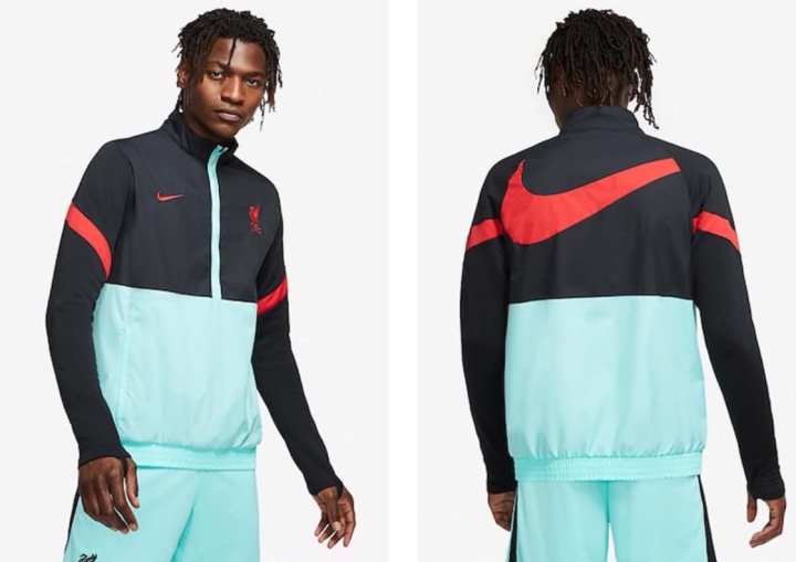 利物浦-利物浦和耐克这对新合作伙伴所打造的系列,这件半拉链运动夹克采用了撞色拼接,黑色搭配以源自客场球衣的水鸭绿色,背后有着超大号的红色Swoosh。