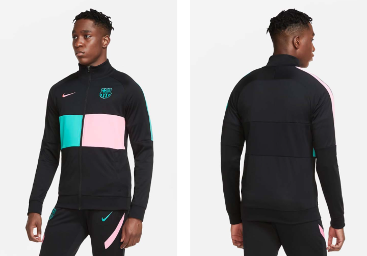 巴塞罗那-受新赛季第三球衣启发的粉红色与海绿色与黑色产品强烈的对比,胸前色块与logo撞色搭配。
