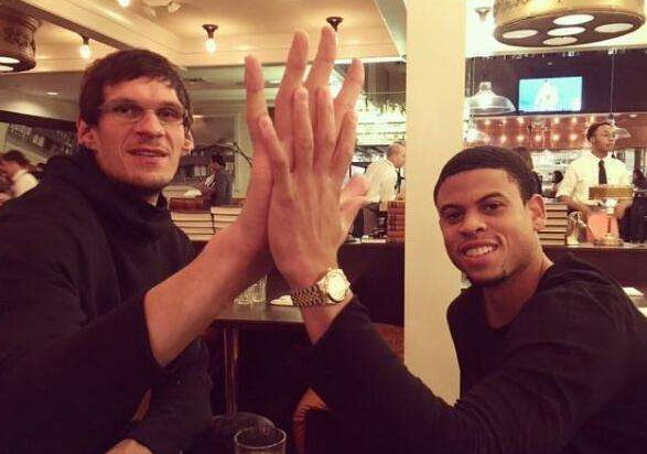 NBA手掌大的球星很多,张伯伦2根手指抓球,乔丹单手抓南瓜,但是大到博班这样夸张,也就他一个。博班手掌是NBA有记录的最大手掌,他的手掌完全打开,比一张A4纸都还大。这一次跟友人击掌合影,感觉博班的手比友人的头都大。
