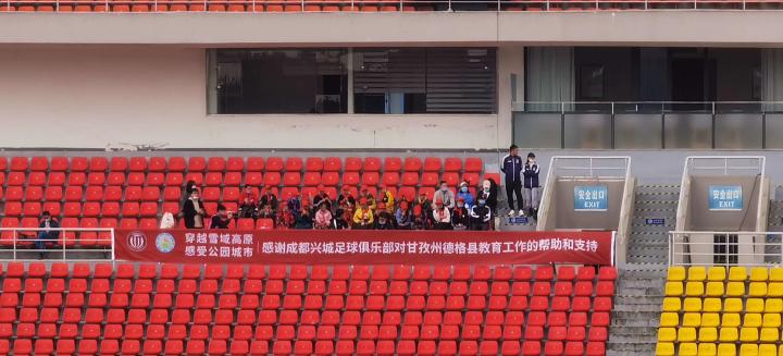 10月15日,成都兴城人居对阵呼和浩特的比赛现场,成都兴城足球俱乐部邀请了一群特殊的小观众。他们是甘孜州德格县马尼干戈片区寄宿制学校足球队的小学生们。