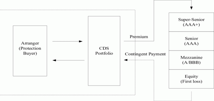 那么这些不良贷款的MBS怎么卖呢?聪明地银行家们把信用不好的贷款全部包装成CDO,分成两个tranche,A级tranche利息低;B级高。那么如果这整个贷款中如果有违约的部分,B级先亏,B级亏完了再亏A级的部分,然后分别卖给不同偏好的投资者。B级的没人要怎么办?我自己担个保,然后找评级机构评个AAA,又是好产品开卖了!到后来不良贷款都用完了,那我们来卖CDO的CDO,这被叫做CDO synthesize。