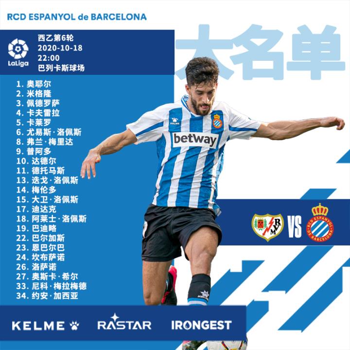 皇家西班牙人俱乐部北京时间10月18日22:00,西乙第6轮,西班牙人客场对阵巴列卡诺。