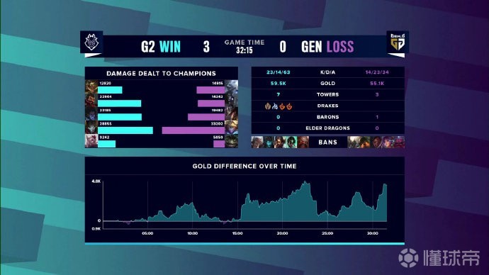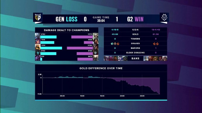 第31分钟,双方中路爆发团战GEN狗熊想要独自一人切入后排,但G2洛直接配合队友将其击杀,随后展开追击击杀GEN最后一人后一波结束了比赛,恭喜G2晋级四强。