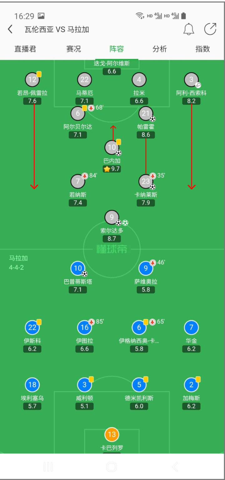 球队在下半赛季5:1复仇马拉加的比赛堪称巴尔韦德的代表作,要知道上半程的马拉加可是4:0完封了佩莱格里诺的球队。是役,巴尔韦德将球队主力右边锋费古利安排作为了后手,将边路空间充分留给了两名边后卫,若纳斯和卡纳莱斯向中间拿球。名义前腰巴内加后撤,与老队长阿尔贝尔达合作梳理中后场的出球与拦截。而帕雷霍与卡纳莱斯的“卡帕连线”,显得行云流水,为锋线上的索尔达多送出了不少杀机。