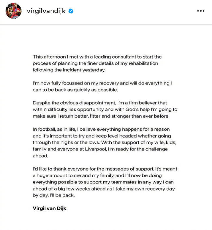 事实上,除了身体上的影响之外,重伤给球员内心造成的创伤同样是不可忽视的。范戴克本人也在第一时间发布了声明,具体内容如下: