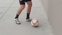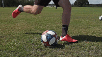 当我们接到传球后,将球触到离我们身体几英尺远的地方,然后我们快速衔接下一次触球用力将球击向球门边角。