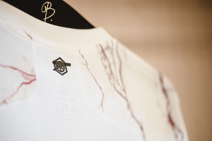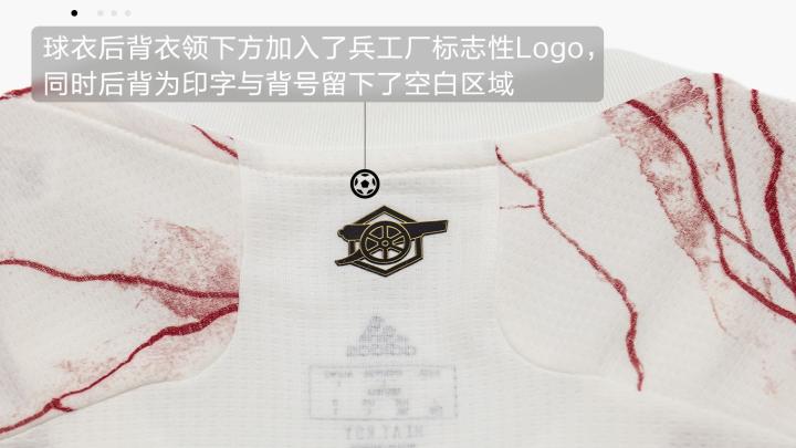 白色上衣使用了非常独特的纹理设计,营造出与众不同的视觉效果,而这款图案设计灵感,源自海布里东看台以及其久负盛名的大理石大厅的图案和色彩,俱乐部传奇人物赫伯特·查普曼的雕塑也安放在这样的大理石基座之上,而且06年主场迁往酋长球场之后,海布里东看台的立面也一直保留下来,永远地铭记着阿森纳的传奇故事。所以现在再看球衣上的图案,是不是更有意义?不会再说像“血染球衣”了吧!