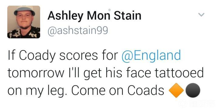 兑现诺言,狼队一球迷为了考迪纹身 Ashley Stain今年21岁来自怀特岛,他在英格兰面对威尔士前一天在推特上说,如果考迪明天为英格兰进球,我就把他纹身在腿上。而最终他在上周五兑现了他的诺言。 阿什利说:“我觉得这个纹身真棒。考迪的哥哥已经让考迪看过了这个纹身。” 而考迪看到纹身之后特地给这位狼队球迷发了一条信息,他说:“嗨,Ashley ,你怎么样?这些天快有一百万人给我看了你发的推特了。我现在知道你是狼队的死忠。”