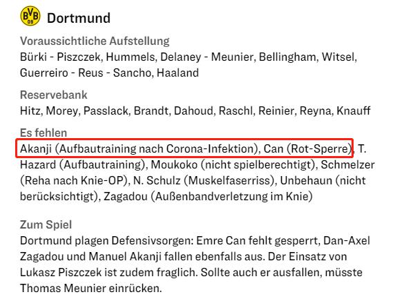 多特蒙德客场面对拉齐奥,阵容中也不是非常整齐,主力后卫阿坎吉继续因上缺席,埃姆雷-詹因红牌停赛。因此,球队将后腰德莱尼撤回到中后卫位置,和胡梅尔斯一起搭档中后卫。多特蒙德的后防线属于临时拼凑状态,胡梅尔斯的压力陡然增加。从这点可以看出,客场作战还是要在进攻中有所作为才可以减轻防守中的压力。进攻线看似完整,哈兰德,罗伊斯桑乔的能力不错,但是面对意甲球队的防守时,攻击线上的球员想要取得进球的难度不小。