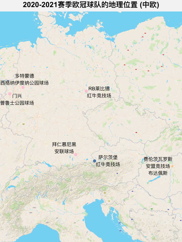 意大利北面就是中欧地区了,这里是本赛季参加欧冠比赛球队最多的区域,共有6支,其中奥地利1支,匈牙利1支,德国4支。