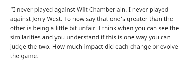乔丹在采访中提到了张伯伦、韦斯特和拉塞尔的名字,这些都是他的前辈。他没有直接和詹姆斯对比,但其实道理是一样的,他们属于不同的时代,他们从未有过交锋,评选他们之中谁更伟大,本身就很难客观。就像乔丹说的那样,“这是一个不公平的比较,也是一个不公平的选择。”
